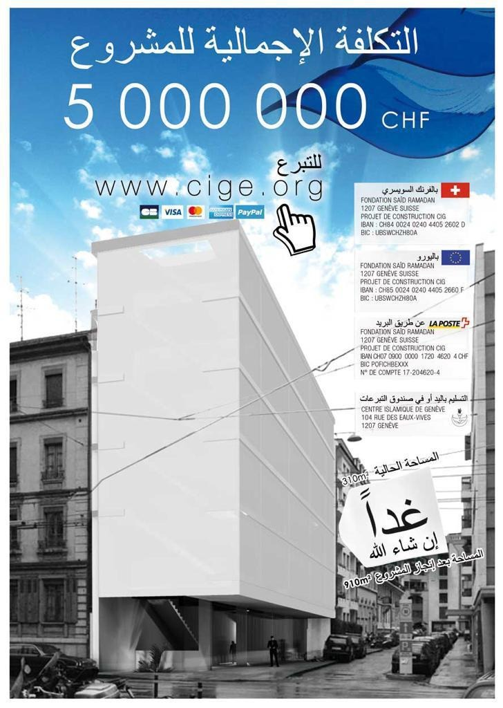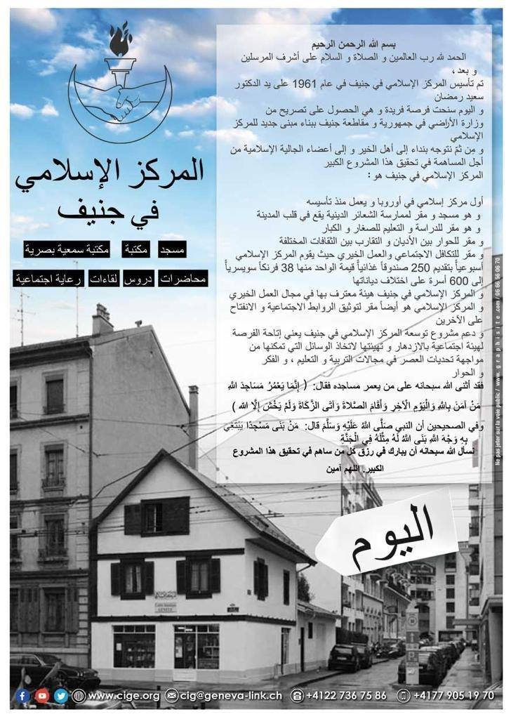 الحمد لله رب العالمين و الصلاة و السلام على أشرف المرسلينو بعدتم تأسيس المركز الإسلامي في جنيف في عام 1961 على يد الدكتورسعيد رمضان، و اليوم سنحت فرصة فريدة و هي الحصول على تصريح منوزارة الأراضي في جمهورية و مقاطعة جنيف ببناء مبنى جديد للمركزالإسلامي، و من ثم نتوجه نداء إلى أهل الخير و إلى أعضاء الجالية الإسلامية من أجل المساهمة في تحقيق هذا المشروع الكبيرالمركز الإسلامي في جنيف هو :أول مركز إسلامي في أوروبا و يعمل منذ تأسيسهو هو مسجد و مقر لممارسة الشعائر الدينية يقع في قلب المدينةو هو مقر للدراسة و التعليم للصغار والكبارو مقر للحوار بين الأديان و التقارب بين الثقافات المختلفةو مقر للتكافل الاجتماعي والعمل الخيري حيث يقوم المركز الإسلاميأسبوعية بتقديم 250 صندوقا غذائي قيمة الواحد منها 38 فرنك سويسريةإلى 600 أسرة على اختلاف دياناتهاو المركز الإسلامي في جنيف هيئة معترف بها في مجال العمل الخيريو المركز الإسلامي هو أيضأ مقر لتوثيق الروابط الاجتماعية و الانفتاح على الآخرينو دعم مشروع توسعة المركز الإسلامي في جنيف يعني إتاحة الفرصةالهيئة اجتماعية بالازدهار و تهيئتها لاتخاذ الوسائل التي تمكنها منمواجهة تحديات العصر في مجالات التربية و التعليم ، و الفكرفقد أثنى الله سبحانه على من يعمر مساجده فقال: ( إنما يغمر مساجد اللهمن آمن بالله واليوم الآخر وأقام الصلاة واثى الزكاة ولم يخش إلا الله )وفي الصحيحين أن النبي صلى الله عليه وسلم قال: من بنى مسجدا يبتغي به وجه الله بنى الله له مثله في الجنة ، نسأل الله سبحانه أن يبارك في رزق كل من ساهم في تحقيق هذا المشروع ، الكبير. اللهم آمين